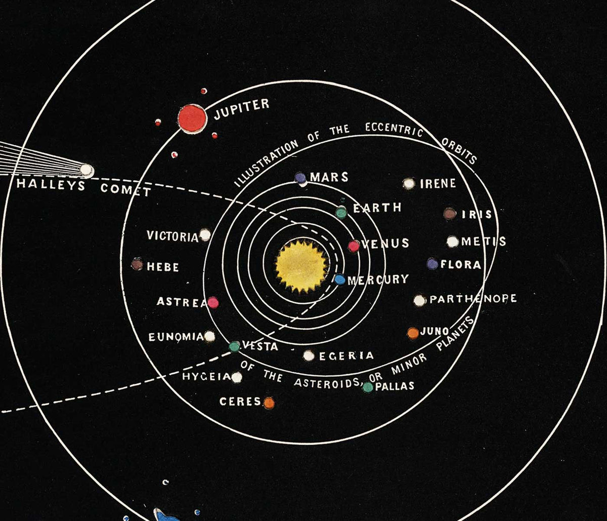 Joan Miro · 2018 · Playful abstract poster of orbiting shapes and star-like marks on deep blue