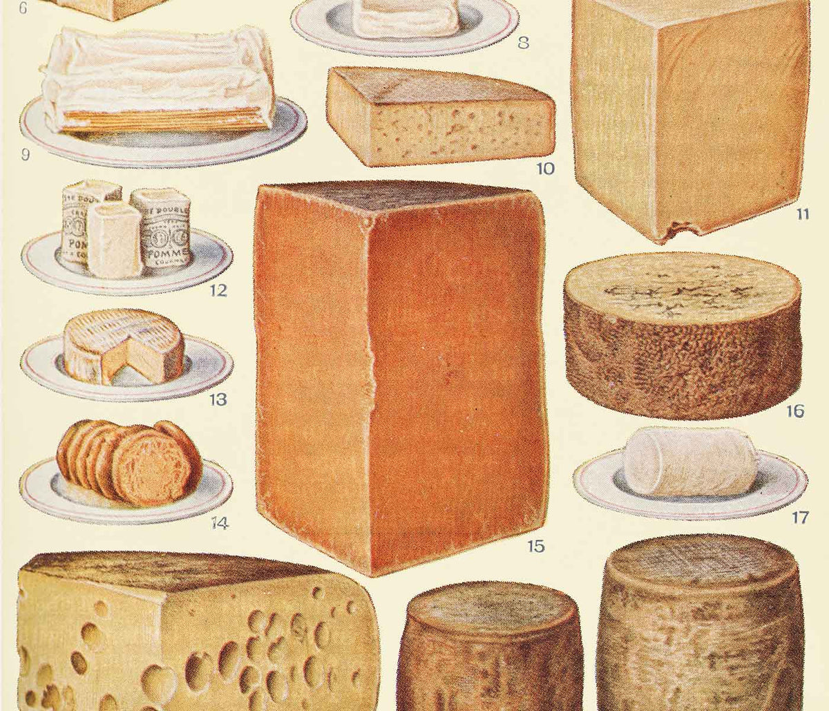 Beeton · 1923 · Detailed cheese vintage print with labeled wedges and rounds in warm buttery tones