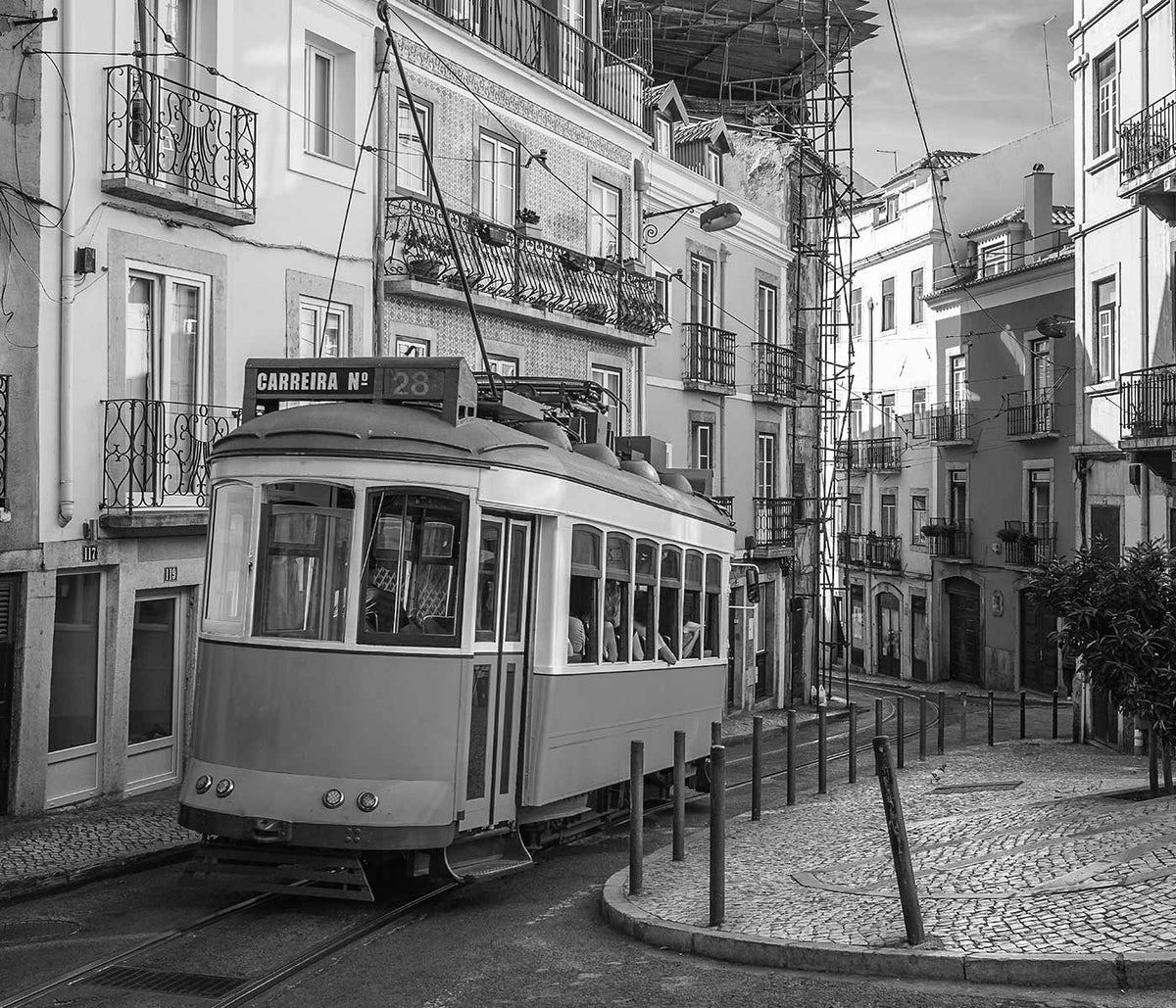 MORYARTY · Modern · Monochrome Lisbon Tram 28 poster with crisp city lines and nostalgic travel mood