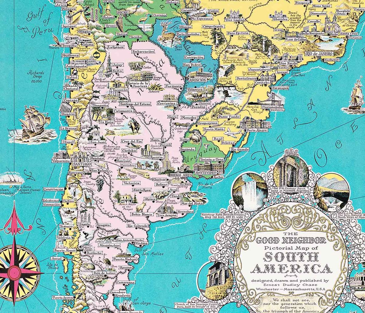 • Colorful illustrated map poster of South America by Ernest Dudley Chase titled The Good Neighbor of South America, framed and displayed in home decor Colorful illustrated map poster of South America by Ernest Dudley Chase titled The Good Neighbor of South America, with black aluminium frame on white background