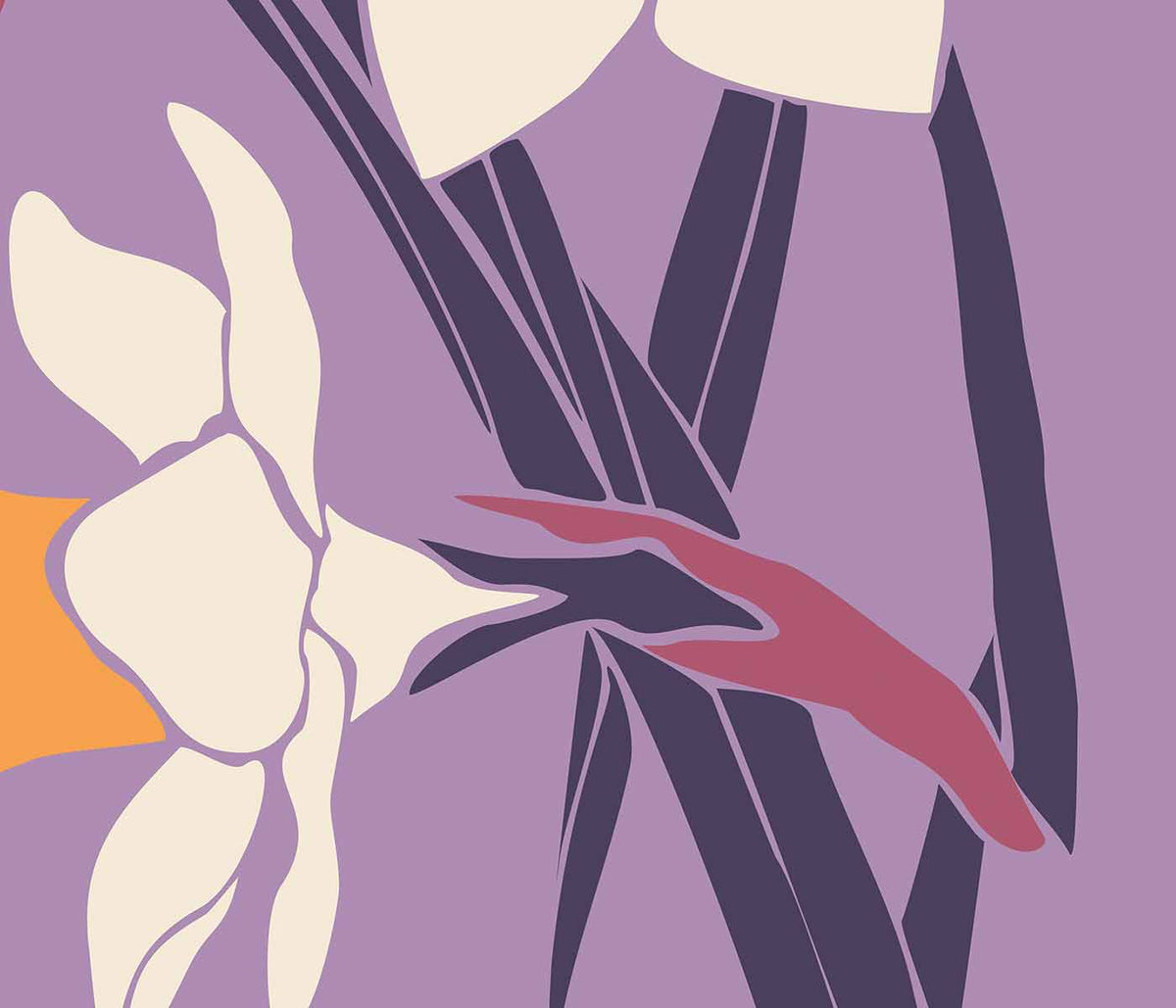 MORYARTY · 2021 · Pòster de mercat floral enèrgic amb fons taronja i flors gràfiques rosa i porpra